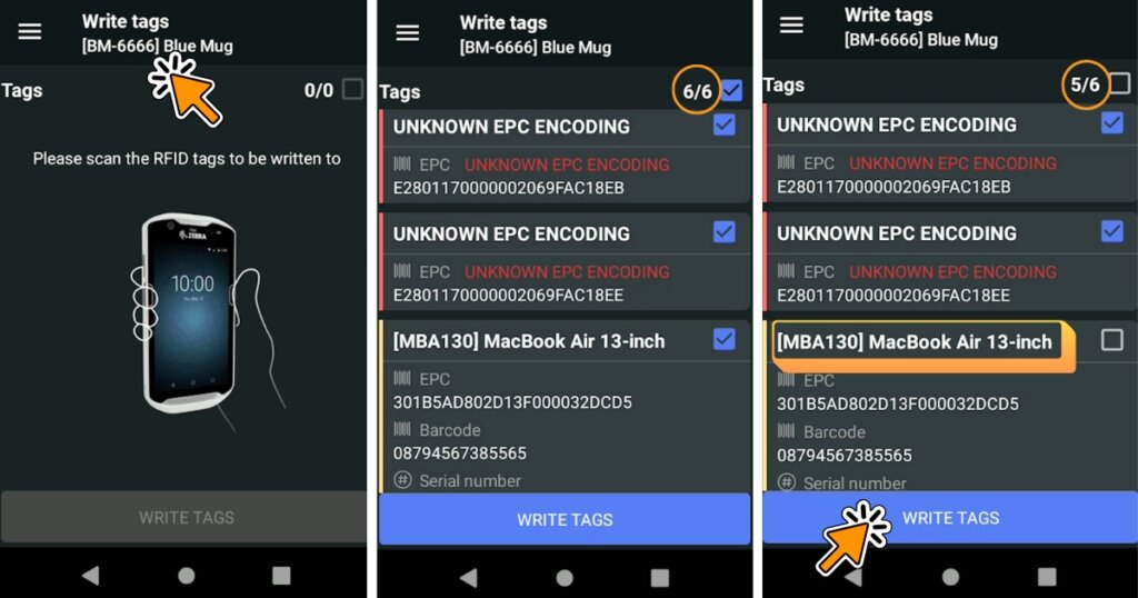 - Aim the scanner at the tags and tap the WRITE TAGS button.